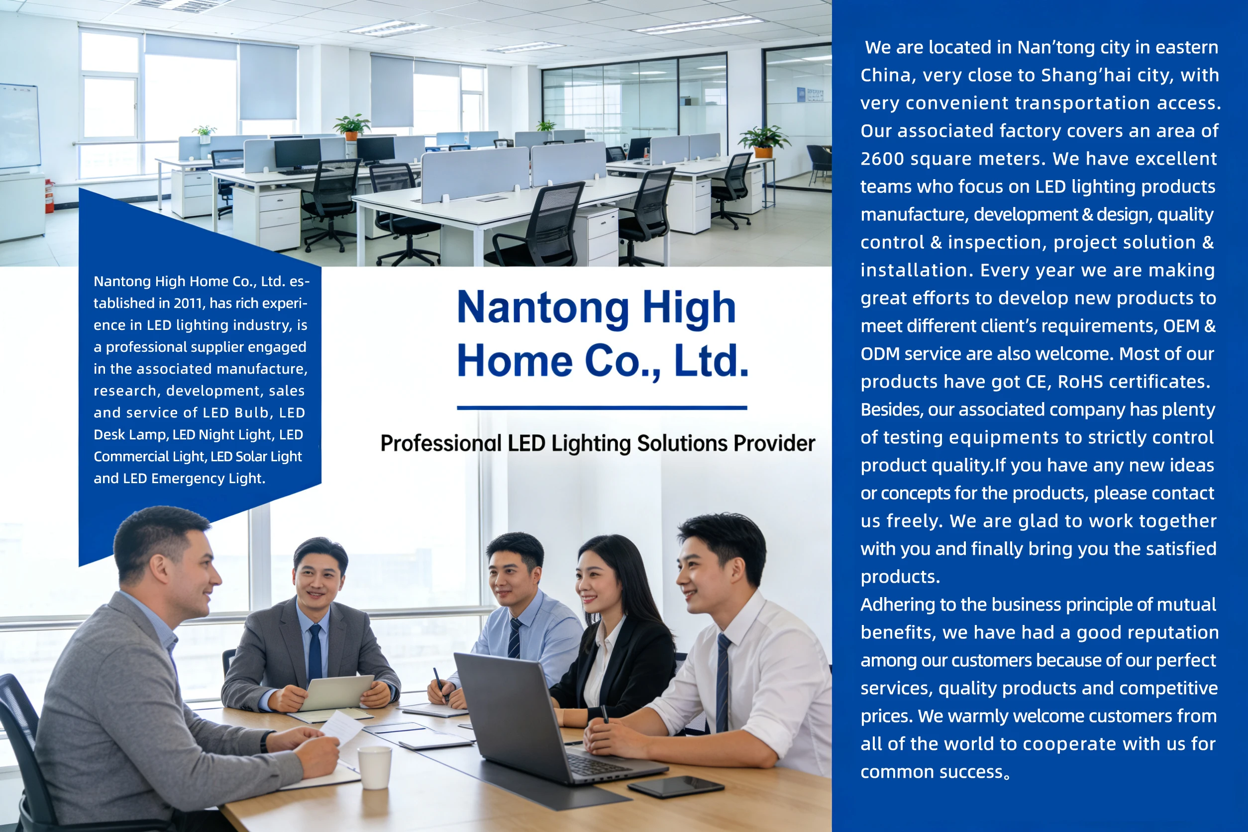 Nantong High Home Co., Ltd. is a leading LED lighting manufacturer established in 2006, specializing in eco-friendly, high-performance lighting solutions. With a strong R&D team and complete QC system, it ensures quality through pre-production samples and final inspections. Certified with UL, CE, and RoHS, the company serves global markets with innovative products and competitive pricing.